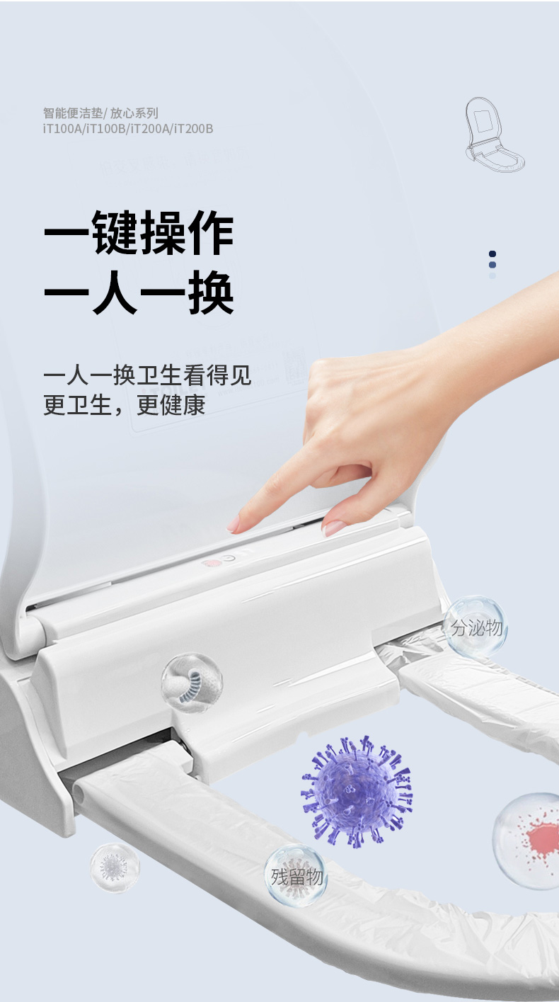 艾拓瑞iTOILET智能便潔墊(自動(dòng)換套馬桶蓋),自動(dòng)更換一次性便潔套(衛(wèi)生膜),一人一換,衛(wèi)生看得見(jiàn)。獨(dú)立的電池艙,多重防水防潮;適用于酒店賓館/機(jī)場(chǎng)/商場(chǎng)/娛樂(lè)休閑/會(huì)所/會(huì)展等公共場(chǎng)所馬桶。